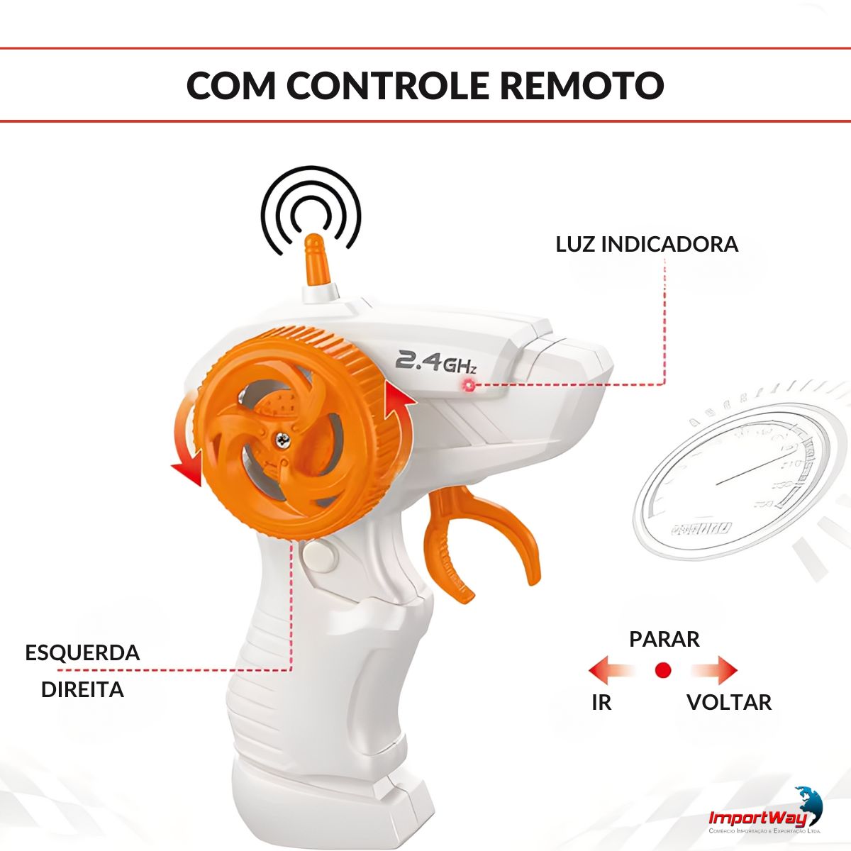 • Possui controle remoto com 4 funções: direita, esqueda, frente e ré