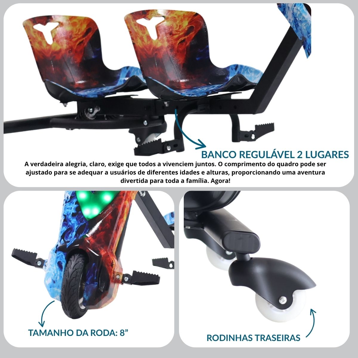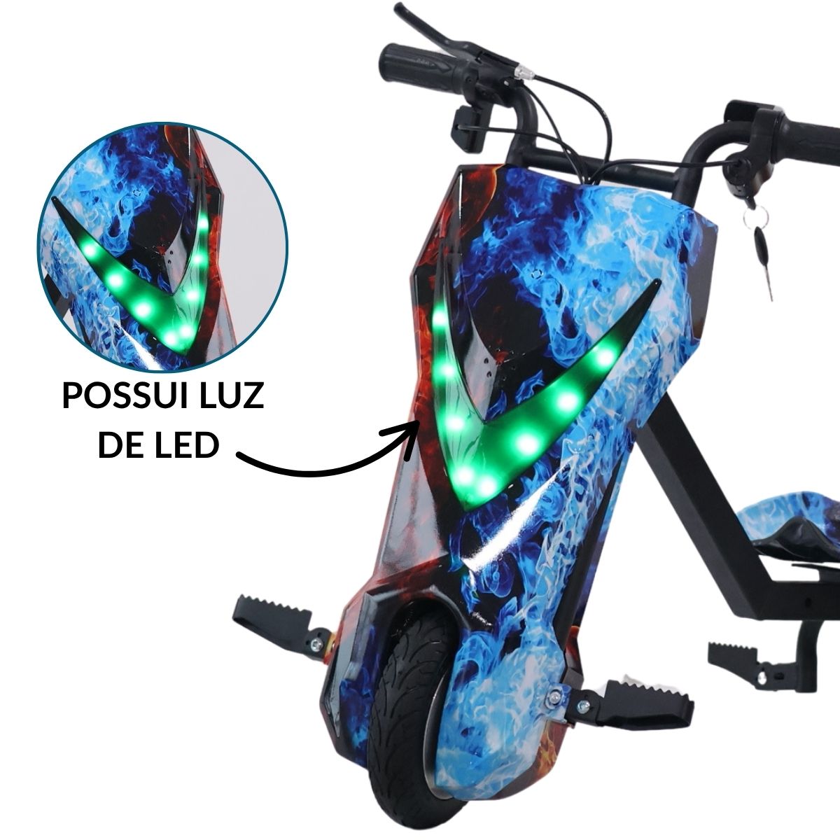 Possui freio dianteiro, além de luz de LED, deixando a brincadeira ainda mais radical.