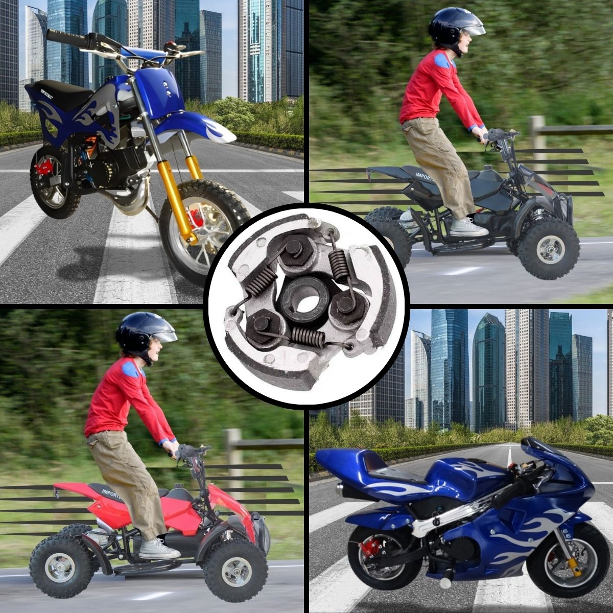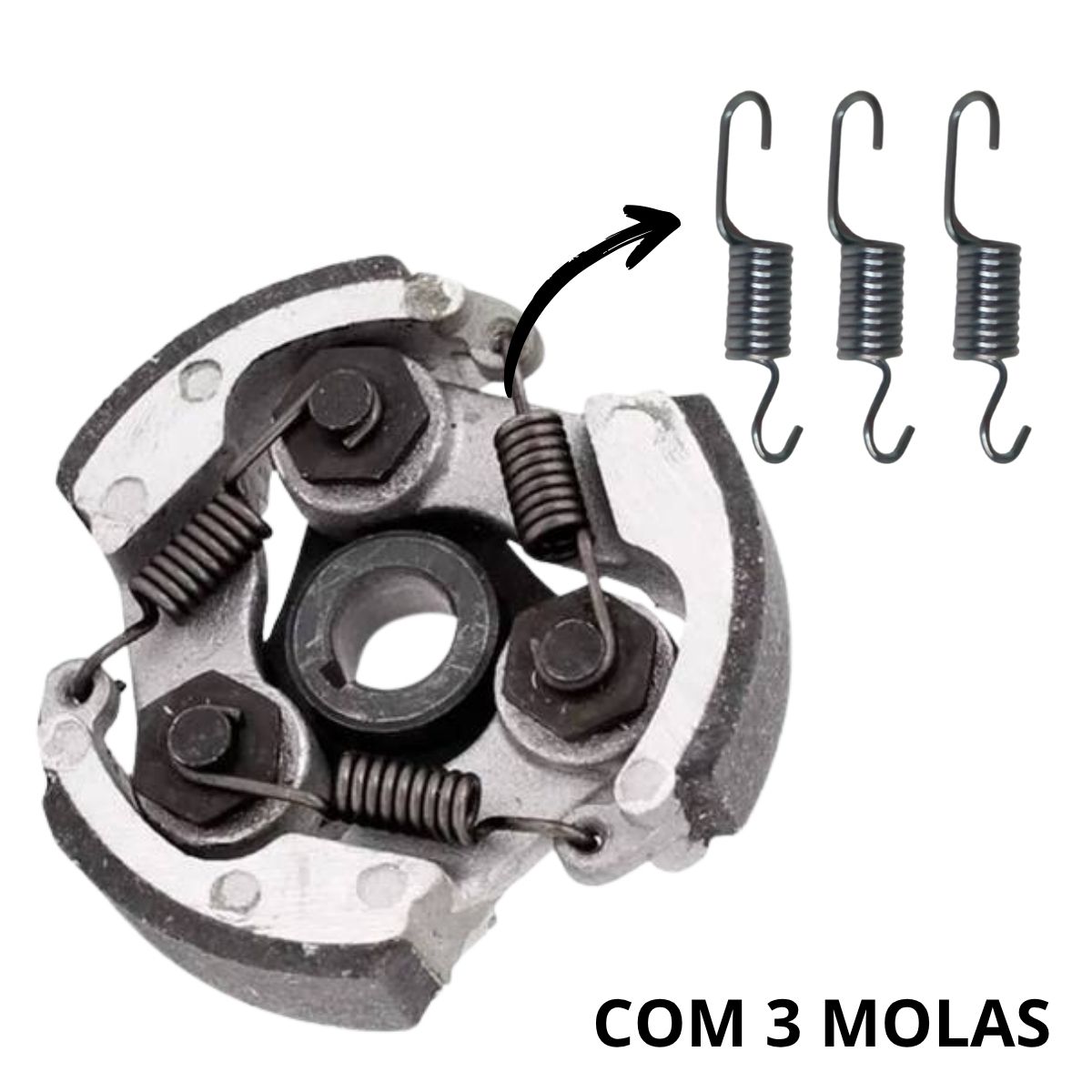 A embreagem 3 molas é usada principalmente em motos pequenas, scooters e motores 2 tempos, como os de mobiletes, minimotos, kartings ou roçadeiras. Ela funciona como uma embreagem centrífuga automática, ou seja, acopla e desacopla o motor da transmissão conforme a rotação do motor.