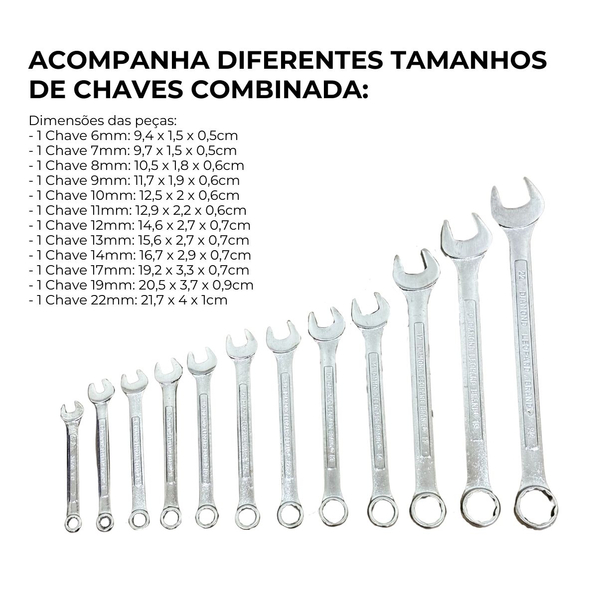 • • Dimensões das peças: - 1 Chave: 9,4 x 1,5 x 0,5cm - 1 Chave: 9,7 x 1,5 x 0,5cm - 1 Chave: 10,5 x 1,8 x 0,6cm - 1 Chave: 11,7 x 1,9 x 0,6cm - 1 Chave: 12,5 x 2 x 0,6cm - 1 Chave: 12,9 x 2,2 x 0,6cm - 1 Chave: 14,6 x 2,7 x 0,7cm - 1 Chave: 15,6 x 2,7 x 0,7cm - 1 Chave: 16,7 x 2,9 x 0,7cm - 1 Chave: 19,2 x 3,3 x 0,7cm - 1 Chave: 20,5 x 3,7 x 0,9cm - 1 Chave: 21,7 x 4 x 1cm