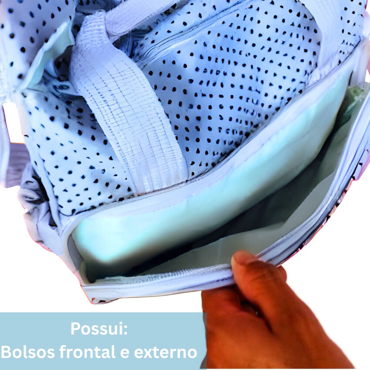 As duas bolsas maiores contém um bolso frontal, bolsos externos para apoio das mamadeiras e um bolso interno com zíper.