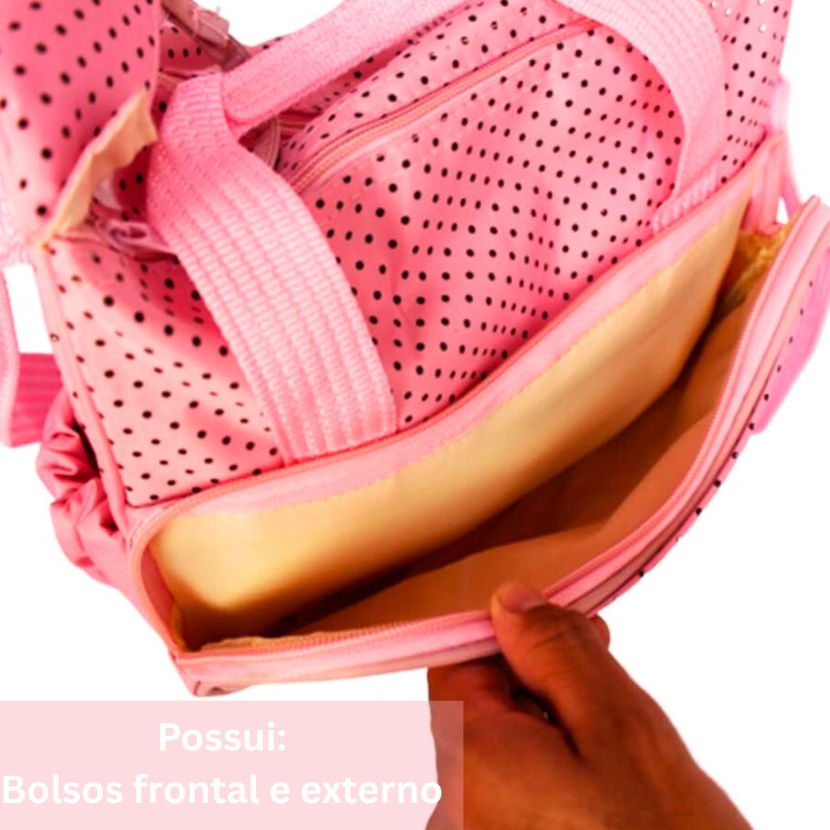 As duas bolsas maiores contém um bolso frontal, bolsos externos para apoio das mamadeiras e um bolso interno com zíper.