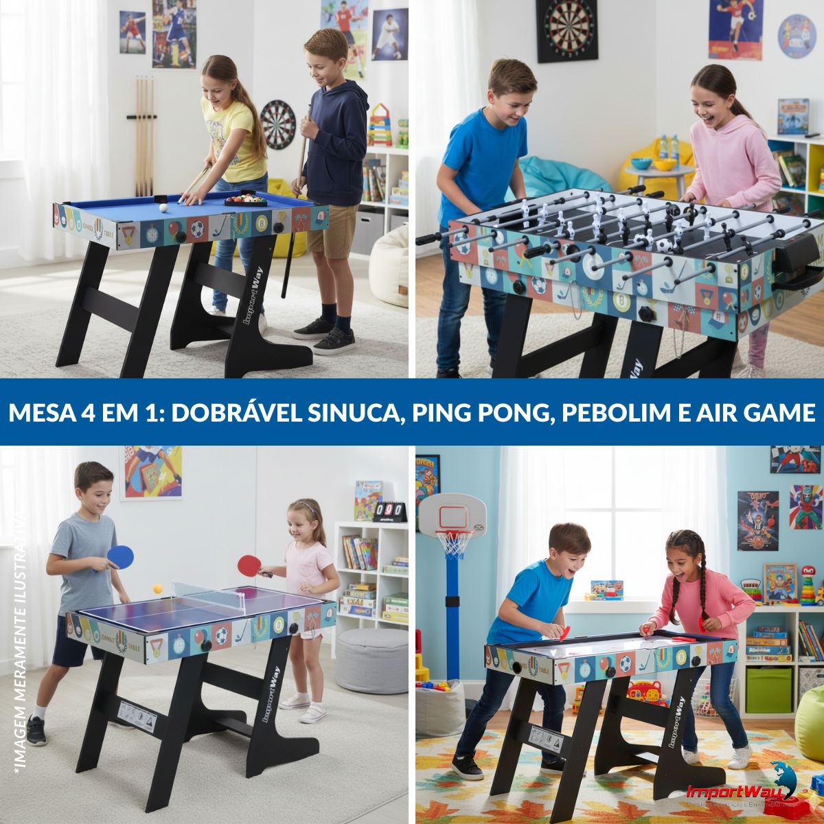 A escolha perfeita para quem busca máxima diversão, praticidade e economia de espaço. Com um design inteligente e funcional, ela reúne quatro jogos clássicos em um único produto: bilhar, ping pong, air game e pebolim, garantindo entretenimento completo para todas as idades.