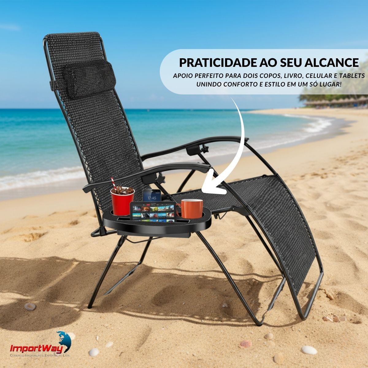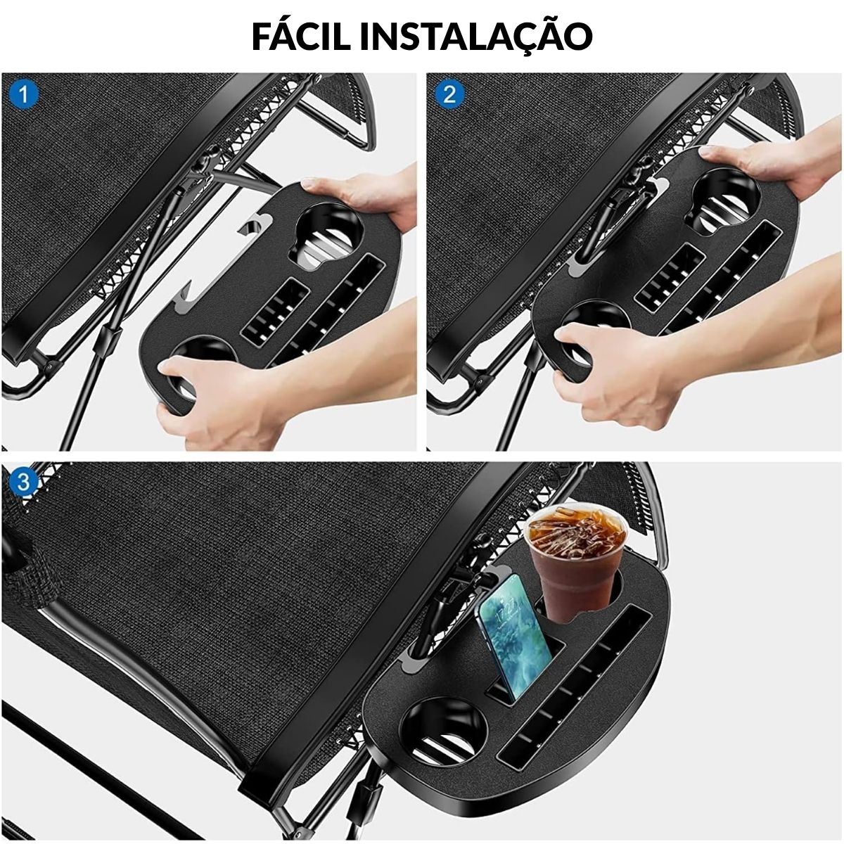 Com design funcional e encaixe fácil, a mesa se fixa na lateral da cadeira, criando um espaço estável para apoiar bebidas, celular, livros, petiscos e outros itens pessoais. Conta com 2 suporte para copos, evitando derramamentos e proporcionando mais comodidade.