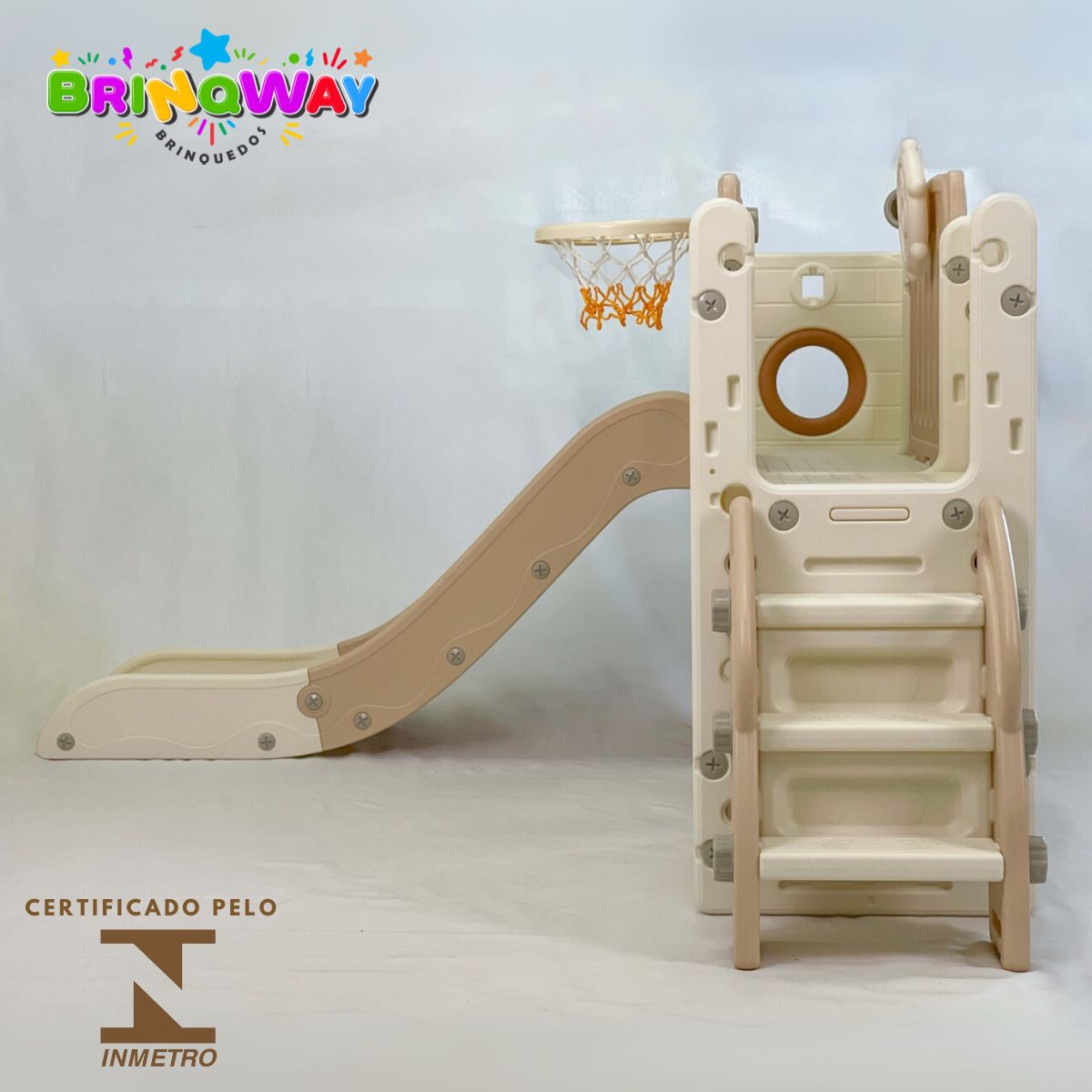 Playground Importway 5x1 irá trazer a diversão da criançada, e além de tudo ele tem a opção de escorregador, túnel, telescópio, espaço multifuncional inferior e cesta para jogar basquete e ter um dia de muita diversão.