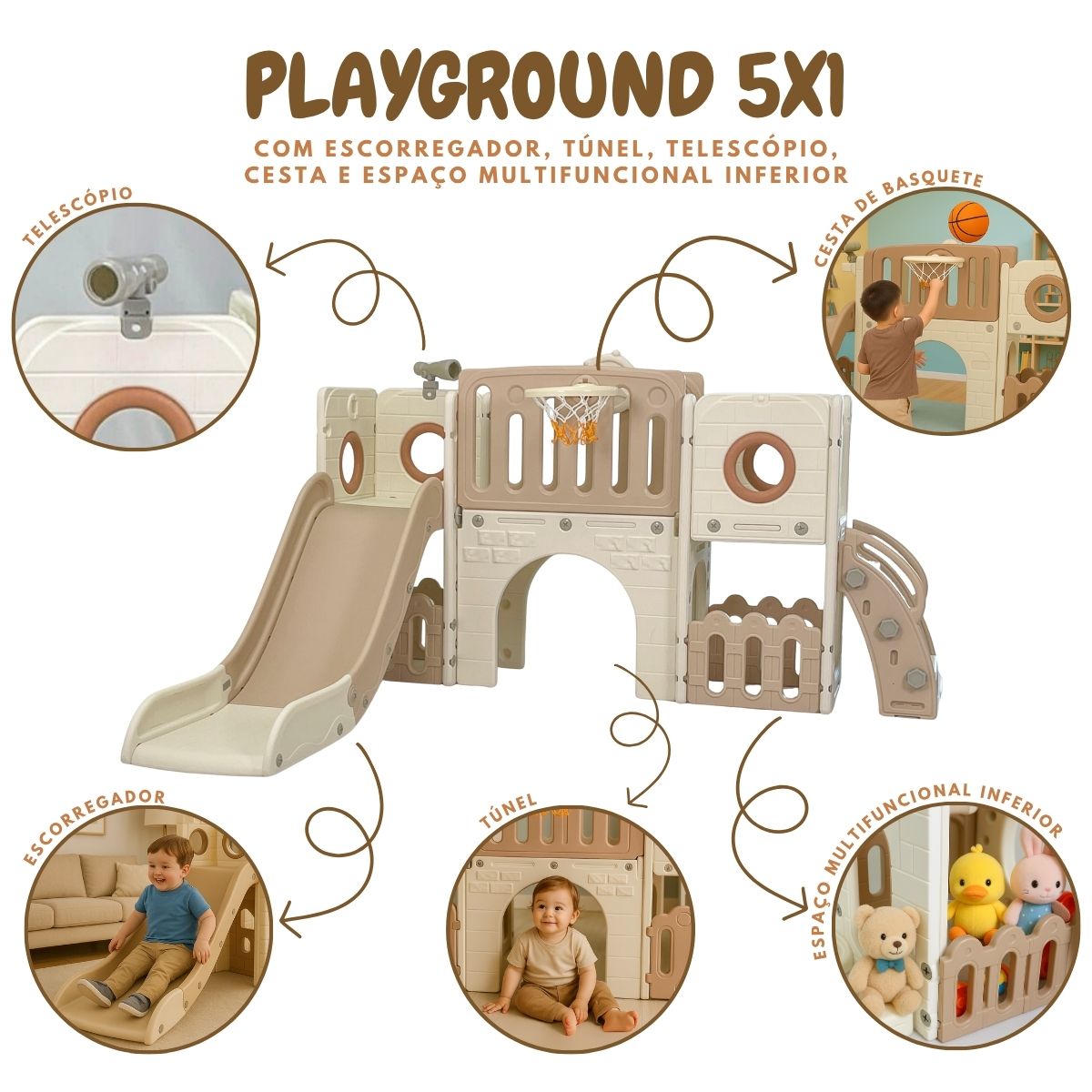 • • Playground infantil 5x1 com escorregador, túnel, telescópio, cesta e espaço multifuncional inferior