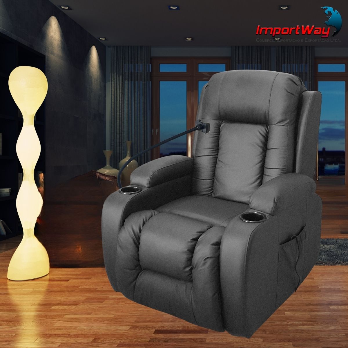 A Poltrona Reclinável Massagem/Aquecimento Suporte Celular Preto da marca ImportWay é a escolha perfeita para quem busca conforto e relaxamento em casa. Com um encosto reclinável, permite que você ajuste a posição ideal para desfrutar de momentos de tranquilidade. Seu design moderno e funcional se adapta a qualquer ambiente, tornando-se um elemento decorativo e prático.