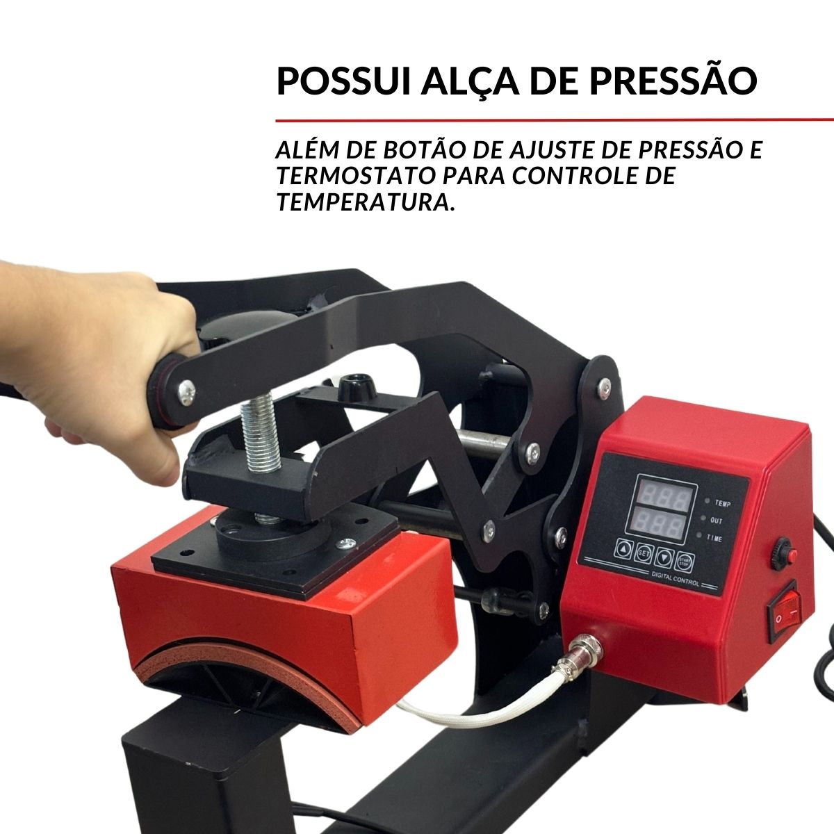 Prensa de fácil manuseio com funções como alarme sonoro e programação de tempo e temperatura, que te ajudarão a maximizar sua produção.