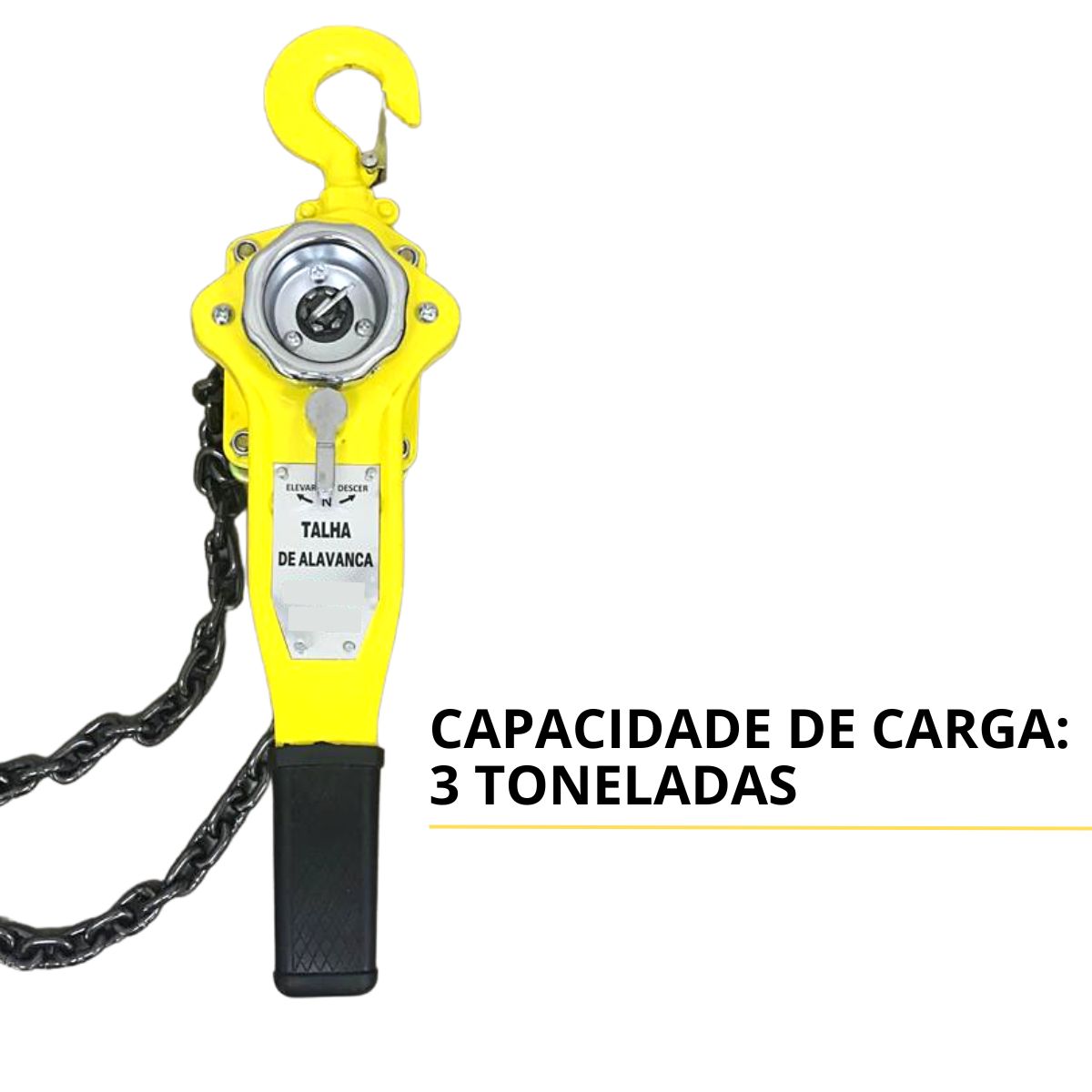 As correntes são de alta resistência e os ganchos possuem trava de segurança para evitar que a carga escorregue ou escape. As talhas manuais de alavanca são simples, versáteis e fáceis de utilizar. Elas são ideais para a elevação de objetos ou máquinas com segurança.